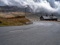 A picturesque landscape in Austria, featuring a winding road surrounded by fog-covered mountains and dramatic clouds. The road surface, coated in tar, adds to the overall drama of the scene. A perfect day for exploring the European highlands.