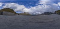 Open space in Austria, with majestic mountains as the backdrop. The asphalt road winds through the landscape, lined with guard rails and Armco barriers. Clouds float overhead, creating a picturesque day.