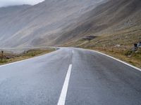 Rain-soaked asphalt road in Austria, winding through the Timmelsjoch landscape. Gloomy, grey sky adds to the melancholic atmosphere. Mountain peaks disappear into the clouds. A wet day in Europe's nature.