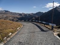 A scenic landscape in Austria, featuring a winding road through the highlands. The road surface is lined with guard rails, cobblestones, and vegetation. Clear skies and mountain views complete the picturesque scene.