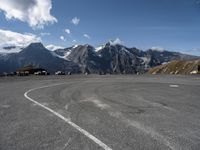 A scenic view of the Austrian highlands with a clear blue sky. The asphalt road winds through the grassy surface, providing an open space for recreational activities. An overlook of the breathtaking European landscape.