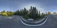 A curved road in the Austrian highlands, surrounded by lush vegetation and towering trees. The clear sky and grey asphalt add to the serene landscape. A perfect day for exploring the natural beauty of Europe's mountainous terrain.