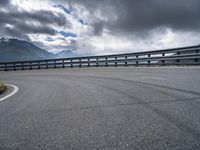 A picturesque landscape in Austria showcasing a rural highway winding through the highlands. The road surface, lined with trees and guard rails, disappears into the horizon between two majestic mountains. Partly cloudy skies add drama to the scene.