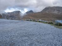 a sheep stands alone on a side walk next to the road with mountains on either side and a cloudy sky overhead