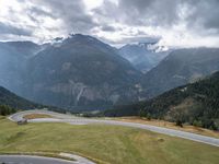 This image captures the stunning landscape of the Austrian highlands. The road leads through the mountains, curving along the slope and offering a breathtaking view of the open space and vegetation. The road surface is made of asphalt and blends perfectly with the natural surroundings. The cloudy sky adds a touch of drama to the scene. This peaceful and rural setting showcases the beauty of nature in Europe. It's a perfect spot to overlook the picturesque countryside. Explore the charming terrain and enjoy the tranquility of the Austrian highlands.