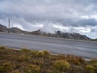 A picturesque landscape in Austria featuring a winding asphalt road surrounded by mountains and highlands. The dramatic sky with cumulus clouds adds to the scenic beauty. Explore the natural beauty of Europe's rural and coastal terrain.