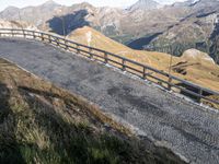 An elevated road in Austria winds through the scenic mountain landscape. The clear sky accentuates the highland's beauty. The top-down view showcases the wood guard rails, cobblestone fences, and Armco barriers. A perfect destination for outdoor recreation.