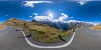 Austria's picturesque landscape captured in this fish-eye lens view of a road surrounded by mountainous terrain. The road curves through the hills, with the clear sky and clouds providing a stunning backdrop. An idyllic day in Europe.