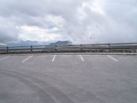 an empty parking lot in a mountain with mountains behind it and clouds on the top of the mountain
