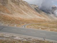 a motorcycle is parked on a mountain road on a cloudy day with smoke rising from the distance