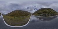 Austria's Timmelsjoch road winds through the dramatic mountain landscape of Europe. Grey skies and gloomy atmosphere add to the overall drama. Panoramic views of the mountain range and wet road surface create an enchanting scene.