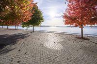 A peaceful autumn day in Toronto, Ontario. The sun shines on the red and golden leaves of deciduous trees, casting reflections on the calm water. Cobblestone road surfaces line the serene landscape.