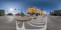 360 degree view of an empty street with cars passing through it in the background and people on the sidewalk