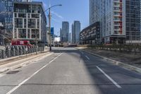 Aerial view of a modern cityscape in Toronto, Ontario. Straight down the road, lined with high-rise buildings and condominiums. Clear sky and autumn vegetation add to the urban design. Thriving city life with well-lit streets and countless skyscrapers.