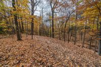 This stunning stock photo captures the beautiful autumn season in Ontario, Canada. The image showcases a leaf covered hillside and woods with a few trees. The landscape features a mix of deciduous trees and evergreen forests. The ground is covered in dirt, grass, and fallen leaves, creating a natural carpet. The clear sky and open space add to the serene and peaceful atmosphere. A gravel surface and brown twigs can be seen in the foreground. Overall, this image is a perfect representation of the natural beauty and tranquility of Ontario, Canada.