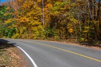 a curved roadway through an autumn forest of trees, yellow and red leaves in the foreground