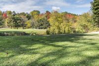 This image captures the beauty of the autumn landscape in Toronto, Ontario, Canada. The photo showcases a lush green lawn surrounded by trees, shrubs, and vegetation. A gravel path meanders through the land lot, providing a scenic route for recreational activities. The open space offers a perfect setting for nature lovers to enjoy the day. The sky is scattered with clouds, adding depth to the overall scene. This vibrant and picturesque view represents the natural beauty and tranquility of Toronto's outdoor spaces during the autumn season.