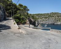 A coastal road in Spain, winding along the rugged coastline of the Balearic Islands. Clear skies and sparkling blue waters provide a picturesque backdrop. The road navigates through curves and switchbacks, leading to a charming harbor with a jetty and a pier.