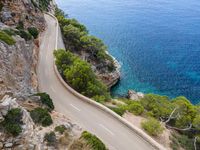 Aerial view of an elevated coastal road in Mallorca, Spain. The asphalt road winds its way through the stunning coastal landscape, offering a top-down perspective of the clear blue water and high cliffs. A perfect day to explore the natural beauty of the Balearic Islands.