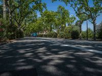 a tree lined street is lined with trees and bushes in the background, and there are two white lines on the road