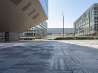 A modern office building in Barcelona, Spain with a futuristic architecture. Clear skies cast hard shadows on the wooden courtyard and surrounding structures. This urban design is the epitome of city life in Europe.