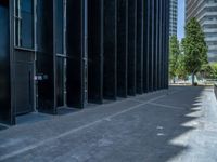Modern architecture in Barcelona's business district. Hard shadows contrast with the sunlit surfaces of office buildings. The city's urban design and vibrant city life create a unique atmosphere.