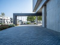 A straight road in Barcelona, Spain, leading to a modern office building in the business district. Clear skies and long shadows accentuate the sleek architecture. An inviting entryway to the urban business landscape of Europe.