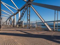 This image captures the stunning cityscape of Barcelona, Spain. The city sits low along the coastal water, with buildings and roads extending straight down towards the ocean. The straight road surface leads to a bridge, creating a fixed link between land and water. The clear sky above provides a beautiful backdrop for the symmetrical metal beams of the bridge. A pier and jetty can be seen in the distance, adding to the overall picturesque view. This photo represents the vibrant and scenic atmosphere of Barcelona, making it a must-visit destination in Europe.