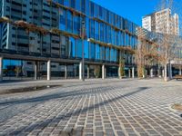 This is an image of a modern and futuristic architecture in the business district of Barcelona, Spain. The city skyline showcases sleek office buildings and storefronts that reflect the urban design of the city. The clear sky and low angle capture the essence of a sunny day in Barcelona. The image represents the energetic city life and vibrant atmosphere of Barcelona, with its blend of modern and traditional architecture. This photo portrays the perfect combination of business and shopping in the heart of Europe.