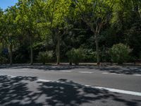 Clear skies over Barcelona's bustling city streets. The hard shadows from the trees and urban design create a striking contrast against the asphalt roads. A perfect day to explore the vibrant city life of Spain.
