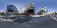 A fisheye view of Barcelona's cityscape, with several circular buildings in the business district. A man skateboarding on the road adds to the city life vibe. Modern architecture and clear skies enhance the urban design.