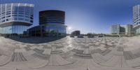 A futuristic cityscape in Barcelona, Spain. The image showcases a mix of modern architecture and traditional buildings, with a fish-eye lens capturing the city from a unique perspective. The clear sky and sunlight create a vibrant atmosphere in this bustling European city.
