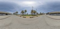 An aerial view of Barcelona's coastal road leading to the pier and harbor. The clear sky and open space provide a high position perspective, showcasing the city's stunning coastline. Greenery and palm trees add a touch of tropical beauty.