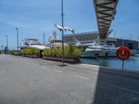 A modern architecture bridge in Barcelona, Spain, casts a hard shadow on the coastal road. The clear sky and calm ocean enhance the beauty of the city's skyline. The urban underpass leads to the pier and harbor, offering stunning views of the European coastline.