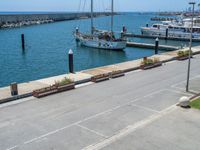 Aerial view of Barcelona's coastal road and pier. Clear skies and an elevated position give a top-down perspective of the bustling harbor. The road stretches along the picturesque coastline of Spain.