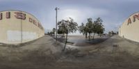 A Barcelona road lined with factories and storage facilities. The concrete surface and wood floors create a distinct aesthetic. Shadows cast by the buildings and vegetation add depth to the open space in the foreground.