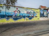 In the heart of Barcelona's urban art district, a graffiti-covered wall stands out against the rugged concrete street. Hard shadows add depth to the vibrant street art. A glimpse into the city's vibrant creative scene.