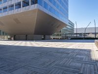 A low-rise modern office building in Barcelona's business district. The facade features a mix of composite materials and large windows creating a futuristic architectural design. The structure is surrounded by a courtyard with wooden floors and shaded seating areas. This urban oasis is a prime example of Barcelona's contemporary architecture.
