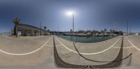 a view of boats on water and buildings with a rope fence around it and a large sun