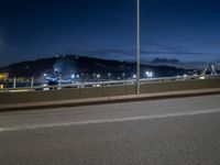 A night view of Barcelona's modern architecture, with the iconic bridge and street lights illuminating the city. The dark sky contrasts with the artificial light, showcasing the vibrant city life in Spain's urban landscape.