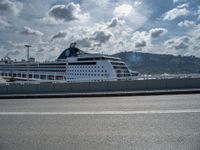 A modern architectural profile of Barcelona's coastal road bridge. The bridge spans across the ocean, connecting the urban landscape to the waterfront. Clouds dot the clear European sky, adding to the picturesque view.