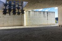 A modern concrete bridge in Barcelona, Spain. The low underpass has a rectangular facade and shadowed structure. It stands in contrast to the cloud-covered sky and the industrial buildings nearby.