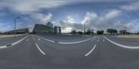 a road in a roundabout with an empty street between it and a group of tall buildings