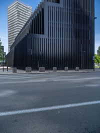 A modern urban cityscape in Barcelona, Spain. The business district is lined with sleek office buildings and shadowy streets. The clear sky and hard shadows enhance the contrast of the city's architecture.