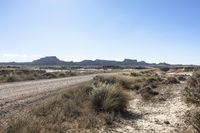 This image captures the rugged and wild beauty of the Bardenas Reales in Navarre, Spain. The low desert landscape is made up of dirt roads and gravel paths that wind through mountains, hills, and plains. The curves and contours of the terrain create a sense of adventure and exploration. The clear blue sky and sunshine illuminate the natural environment, casting shadows on the rocky steppe. This photo perfectly represents the untouched wilderness and natural beauty of the Bardenas Reales in Spain.