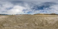 a wide angle shot of a barren dirt field in the distance, with a few clouds in the sky