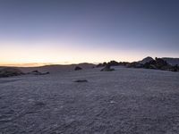 Barren winter landscape in Tenerife, Spain. Snow-covered field dotted with rocks as the sun sets over the mountainside. The clear sky and open space create a sense of wilderness and tranquility.