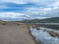 A scenic landscape in Colorado, USA. Open space with a beautiful beach and lake. Clear sky with fluffy clouds on a sunny day. The area is covered in dirt and gravel, creating a natural and serene surface.