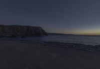 This is an image of the moon rising over the ocean in Portugal, Europe. The coastal landscape shows rocks in the foreground with waves crashing against them. The clear sky transitions from dark to approaching dawn. The photo captures the peacefulness and natural beauty of the open space and the calming sound of the ocean waves. This image is a perfect representation of the serene coastal terrain in Portugal.