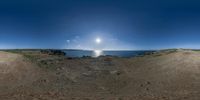 A picturesque beach in Portugal, with a dirt hill overlooking the sparkling azure ocean. The sun visible on the horizon casts a warm sunlight on the sandy coast. A serene view of the natural environment in Europe.